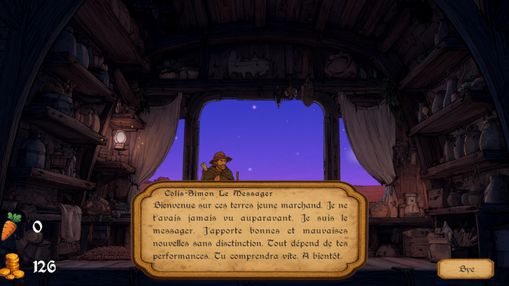 La Chariotte Du Poney Qui Tousse raconte l’histoire d’un marchand ambulant dont le but est de s’enrichir sur le dos des aventuriers en quête de gloire. Bien qu’il s’agisse d’une satyre du capitalisme, le but est plus de pouvoir payer le traitement du poney qui tire la chariotte.